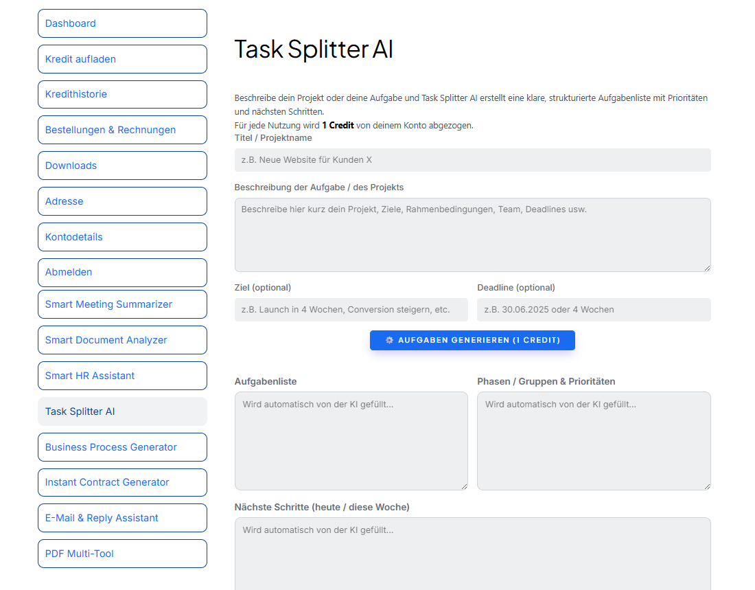 Jedes Tool folgt einem festen Workflow und liefert strukturierte, direkt nutzbare Ergebnisse – ideal für Unternehmen, Teams und professionelle Anwender.